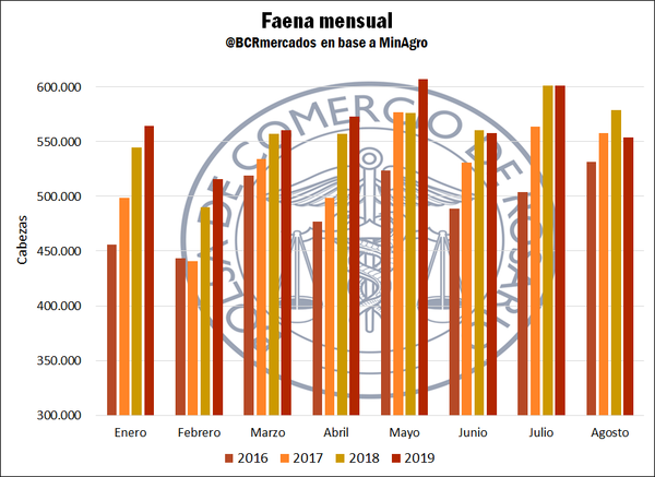 En lo que va de 2019, con datos hasta agosto (provisorios para este último mes), se llevan faenadas algo más de 4,53 millones de cabezas, un 1,5% más que en igual período del año pasado. En cada uno de los meses entre enero y mayo, se observó un crecimiento respeto a los mismos períodos del año previo; considerando el acumulado hasta mayo, en 2019 se faenó un 3,5% más que en 2018. Sin embargo, en los meses siguientes los valores cayeron respecto al año previo.