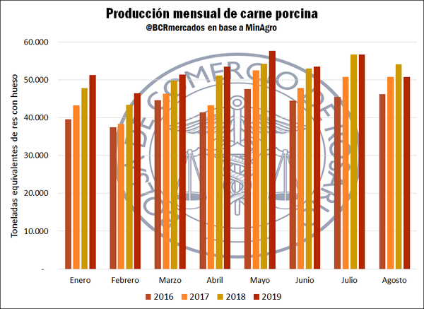 En lo que va de 2019, con datos hasta el mes de julio, el consumo alcanza las 390.718 t mostrando un crecimiento del 2,8% con respecto a igual período de 2018. Esta variación refleja una desaceleración respecto a los registros anteriores. Sin embargo, en mayo de este año se marcó el récord mensual en consumo de carne de cerdo con 60.506 t, superando las 58.621 t de octubre del año pasado. Si se toma el dato de mayo, ese valor implicaría un consumo promedio per cápita anualizado de 16 kg/hab/año.