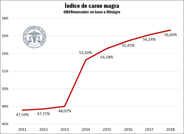 Este índice de carne magra muestra un crecimiento sostenido desde el año 2011. En el 2018 se obtuvo un registro de 56,66%, lo que refleja un incremento en más de 9 puntos porcentuales en 7 años, desde el comienzo de la serie.