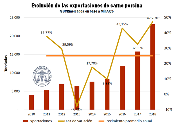 Al igual que la producción, las exportaciones vienen mostrando un crecimiento sostenido desde comienzos de la década. Los datos del Ministerio de Agroindustria reflejan que durante el 2018 se exportaron 22.228 toneladas, lo que conlleva un aumento respecto a 2010 del 495,1%, casi seis veces más. Este crecimiento mostró una importante aceleración en los últimos tres años, con tasas del 47,2% el año pasado, del 35,6% en 2017 y del 43,2% en 2016. Estas variaciones están muy por encima de la tasa de crecimiento promedio anual del período del 25%.