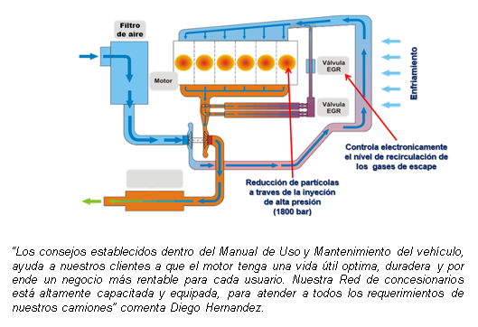 - La tecnología EGR garantiza un mejor aprovechamiento del espacio en el chasis. Además, el sistema no agrega un peso adicional al chasis, no requiere el consumo de urea (ni de su tanque para abastecimiento). No interfiere en el carrozado del chasis;
