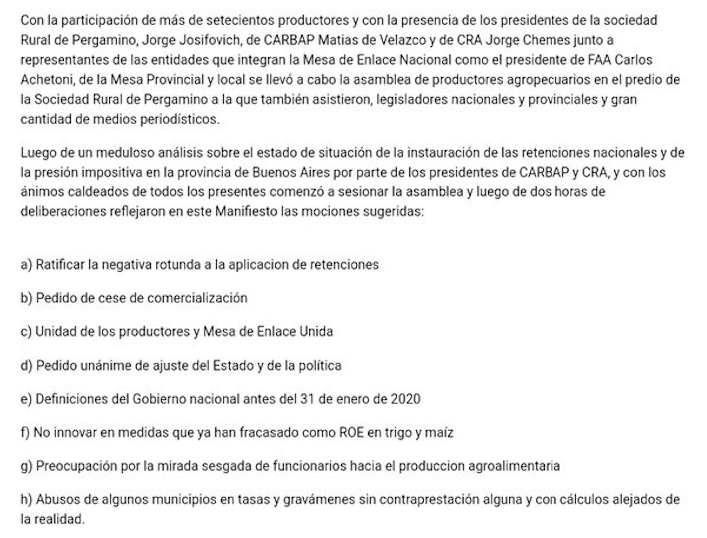 Economía y políticaMultitudinaria Asamblea de Productores pidió que se tomen medidas de fuerza contra el impuestazo que afecta al campo 18 de enero de 2020FacebookTwitterWhatsAppTelegramEmailImpresión Se realizó la asamblea de Productores Agropecuarios en Pergamino y emitieron el siguiente manifiesto. Fuente: CRAMás información agropecuaria cliqueá aquí