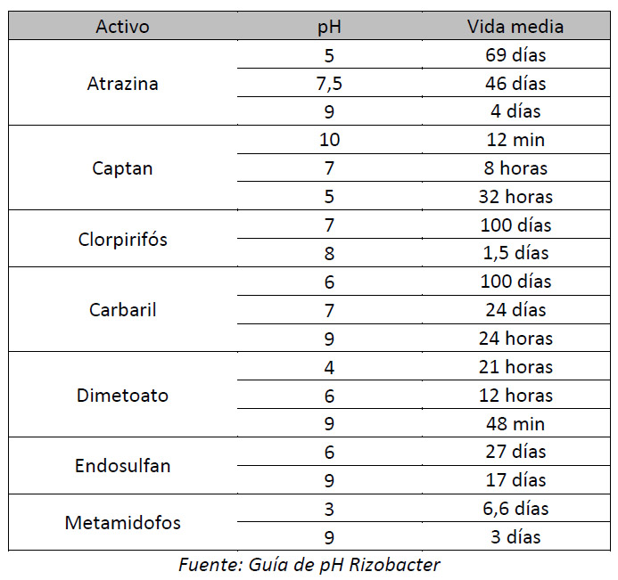 El pH del agua tiene marcados efectos en el proceso de aplicación de los fitosanitarios. Un pH superior a 7 provoca hidrólisis alcalina aumentando la disociación del activo a utilizar, proceso permanente e irreversible. Una manera de cuantificar este proceso es precisamente a través de la reducción en la vida media de los activos, que se define como el tiempo en el cual un producto reduce en un 50% su concentración de activo. A mayor tiempo que dejemos la