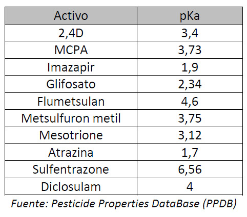 Otro efecto que tiene el pH del agua en los activos se evidencia en la absorción del mismo en las células de la planta. Cuando un compuesto se presenta ionizado (con carga), se dificulta el traspaso del mismo a través de la cutícula y de las membranas plasmáticas, y ocurre lo inverso cuando el compuesto se presenta en forma neutra. La mayoría de los herbicidas usados comúnmente son ácidos débiles (ej: glifosato, 2,4D, sulfentrazone), lo que significa que cuando se disuelven en agua aporta iones H+ (ácido) quedando cargado negativamente, pero no se desionizan completamente (débil), por ello si el agua en el cual lo disolvemos es mas alcalina, mayor va a ser la tasa de ionización de ese compuesto y más difícil será su ingreso a la célula. En general se establece que un pH de 4 a 7 es el indicado para favorecer la absorción de los herbicidas, pero para determinar específicamente cual sería el mejor valor, deberíamos conocer el pKa (constante de ionización del ácido) que nos indica el pH al cual el 50% del compuesto está disociado/ionizado y el otro 50% está en estado neutro. Entonces a mayor pKa de un compuesto, estamos frente a un acido más débil, necesitando valores más altos pH del agua para que se disocie/ionice y así dificultar la absorción; o sea a mayor pKa puede soportar mayores valores de alcalinidad del agua.