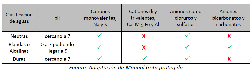 Según el tipo de sales presente en el agua las podemos la clasificar en: