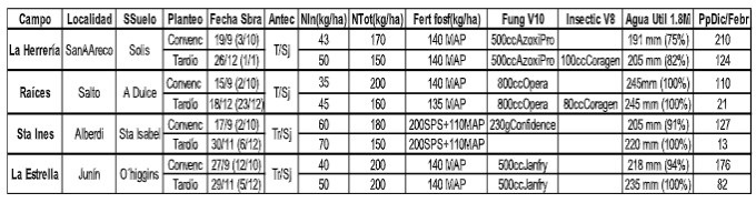 Cuadro 1. Campo, localidad de referencia, serie de suelo, fecha de siembra (emergencia), cultivo antecesor, nitrógeno inicial kg/ha (suelo 0-60 cm), nitrógeno total kg/ha, fertilización fosforada kg/ha, fungicida, insecticida, agua útil (mm) y en porcentaje hasta 1,80 metros y lluvias en diciembre y febrero en cada uno de los ensayos diferenciado por planteo de fecha de siembra.
