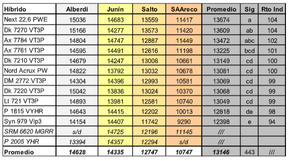 Al sumar datos de campañas anteriores, los híbridos Dk7210VT3P, Dk7220VT3P, Dow22.6 PW, Ax7761VT3P y Lt721VT3P mostraron un buen comportamiento tanto en siembras tempranas como tardías.