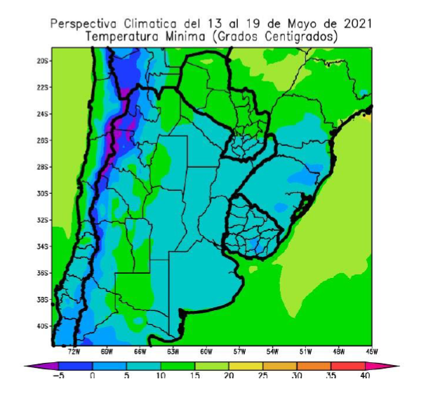 - La mayor parte del área agrícola argentina, gran parte del Uruguay y el sudeste del Paraguay, observarán temperaturas mínimas superiores a 5°C, con riesgo de heladas localizadas, varios focos con valores superiores a 10°C y otros con valores inferiores.