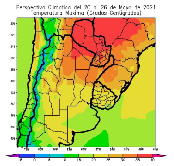 - El este del NOA, la mayor parte de la Región del Chaco, el norte de Santa Fe, Misiones y el sudeste del Paraguay observarán temperaturas máximas superiores a 25°C con un amplio foco con valores superiores a 30°C y otro de más de 35°C.