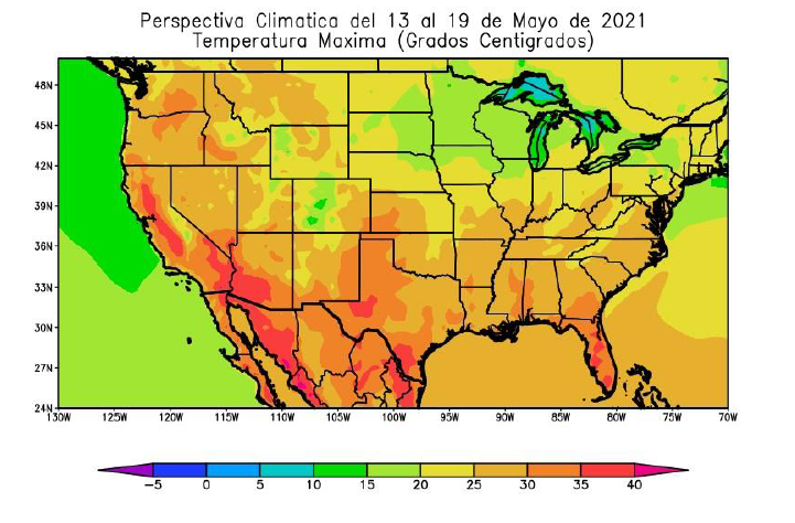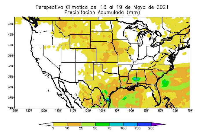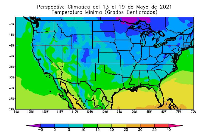 Al comienzo de la perspectiva, los vientos del trópico soplarán con poco vigor, incrementando la temperatura sobre el sur y el centro-norte del área agrícola norteamericana, pero sin lograr extenderse hacia el centro-norte y el norte de su extensión, que registrarán valores por debajo de lo normal para la época. Las precipitaciones serán escasas a muy escasas en la mayor parte del área agrícola norteamericana, a excepción de algunos focos aislados de registros moderados a abundantes sobre el sur de su extensión. La perspectiva finalizará con un fuerte descenso térmico tardío, con riesgo de heladas en la mayor parte del norte y centro-norte del área agrícola norteamericana, y tiempo fresco, por debajo de lo normal aunque sin heladas, en el centro-sur y el sur. La presente perspectiva exhibirá riesgos de consideración: Fuertes lluvias en parte de las Llanuras del centro y sur. 17 de mayo; Posibles inundaciones en partes del este de Texas hasta la frontera de Luisiana, el este de Kansas y el norte de Ohio