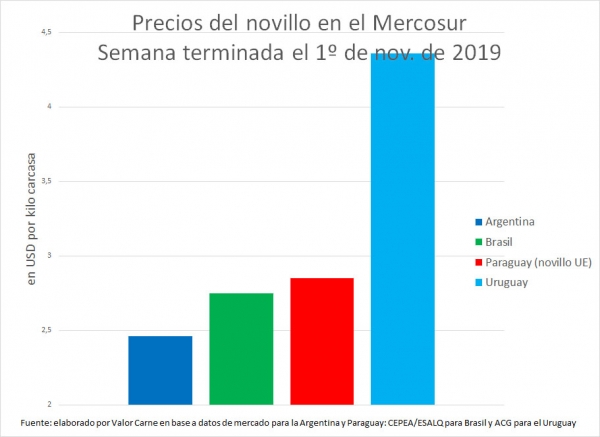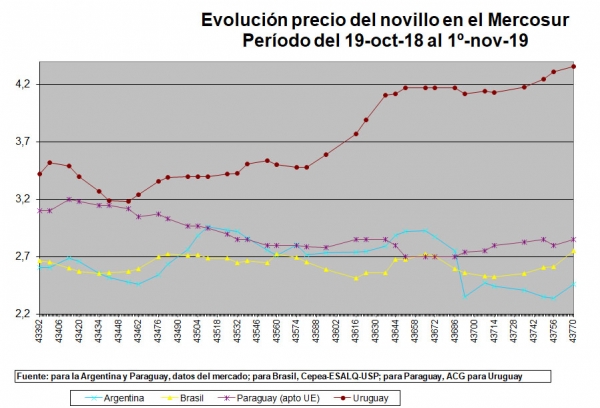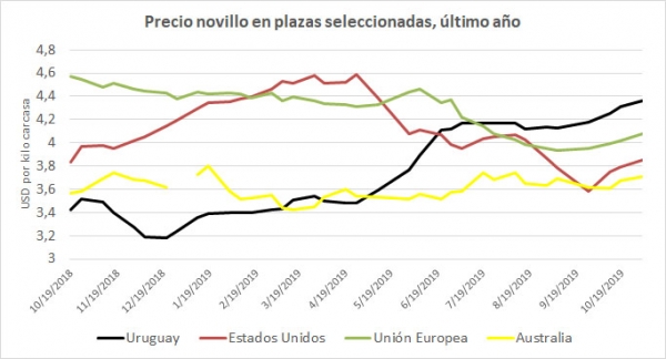 Uruguay: el novillo terminado aumentó 5 centavos, alcanzando USD 4,36. De esta forma siguió la onda expansiva de los precios, a pesar de su muy alto nivel en términos internacionales. A decir de los consignatarios, hubo una muy buena demanda por todas las categorías. La faena de la penúltima semana de octubre fue de 34.500 cabezas, 3% sobre la anterior pero 10% menor al promedio de diez semanas. A pesar de los mayores precios en EE.UU., Europa y Australia, la brecha entre los valores uruguayos y los de estos países sigue inalterada.