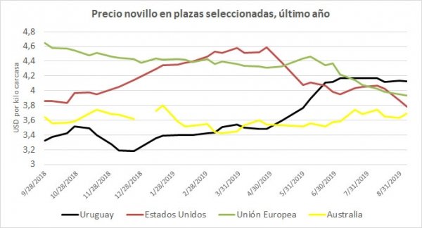 En ese sentido, el precio en EE.UU. mostró un retroceso de 20 centavos en la misma cantidad de días, que incluso lo llevó por debajo del australiano, algo muy poco común. En tanto, también se registraron bajas en la Unión Europea y Australia, dejando a Uruguay muy lejos de los tres mercados, como se ve en el siguiente gráfico.