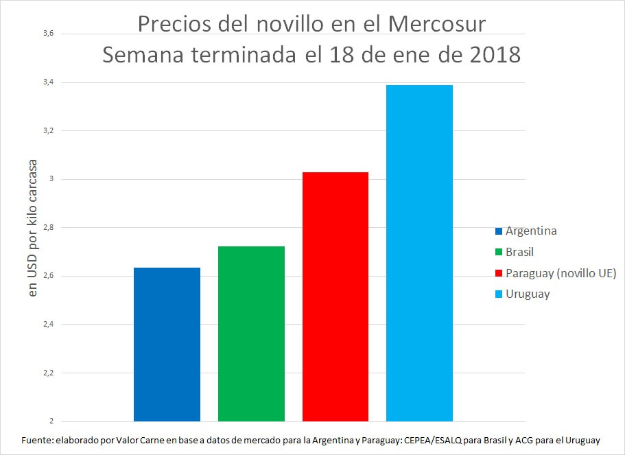 Argentina: el novillo cerró en USD 2,64 por kilo carcasa, 9 centavos (3,5%) más que en el último boletín de Valor Carne, anotando la mayor suba de precios de la región. El movimiento fue producto de una suba de 2,5% en pesos, a causa de que las lluvias dificultaron la llegada de hacienda a las plantas. A esta situación se agregó una nueva revaluación del peso, del 1%, que en los últimos días se ubicó por debajo del límite inferior de la banda cambiaria definida por el gobierno en su negociación con el FMI, pese a las compras que ha venido realizando el Banco Central.