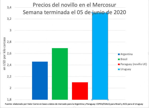 En los últimos diez días, las cotizaciones del novillo en los diferentes países del Mercosur tuvieron el siguiente comportamiento.