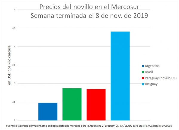 Uruguay: subió 5 centavos, llegando a USD 4,41. De esta forma, continúa la tónica alcista que deja al mercado más descolocado aún a nivel internacional. La faena de la última semana de octubre fue de 35 mil cabezas, 1% más que en la anterior y 8% por debajo del promedio de diez semanas.
