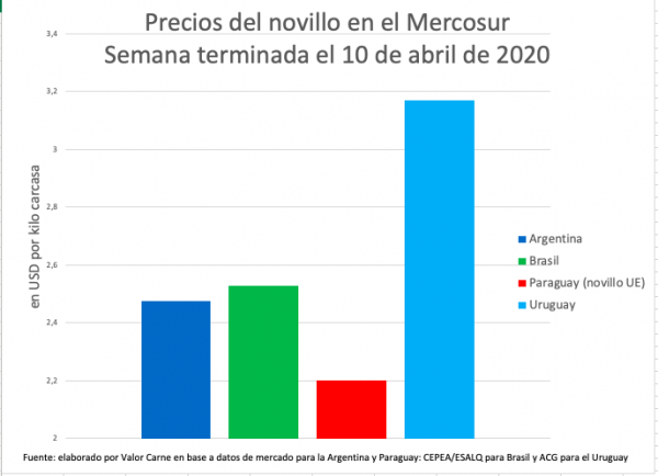 Paraguay: el novillo general recibe ofertas de USD 2,20. En relación al precio de hace diez días (en lo que quizás sea una comparación inadecuada ya que se trataba de animales aptos para la UE), hubo una baja de 25 centavos (10%). La caída se atribuye a la paralización de los negocios externos, adonde se destina el 70% de la carne producida. No hubo propuestas de compra por el novillo apto para Hilton a causa del eclipse en que entró el mercado europeo. Hay varias plantas cerradas por la situación muy negativa de los negocios.