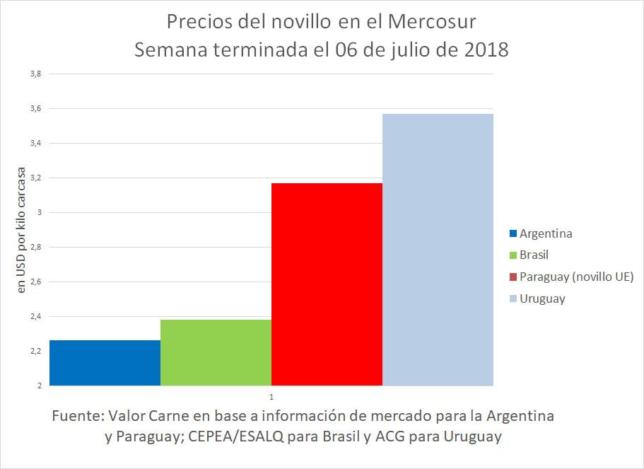 Uruguay: el precio se mantuvo en USD 3,57 puesto en frigorífico, con lo que sigue siendo el más alto de la región, con una diferencia fuerte con relación a sus vecinos. La faena de la última semana de junio fue de 40 mil cabezas, a causa de un día de paro de los trabajadores de la industria frigorífica, marcando una caída de 15% con respecto a la previa y siendo 4% menor al promedio de diez semanas, que a su vez fue 13% inferior al de hace un año. Los consignatarios describen la situación del mercado como con menor oferta y faena, por lo que continúa el equilibrio.