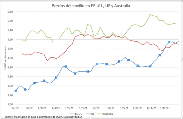 Se indican los valores del novillo terminado en plazas seleccionadas, expresados en USD por kilo carcasa.