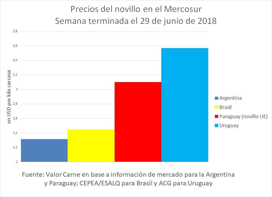 Paraguay: también se mantuvo el precio de hace diez días, de USD 3,10 para el novillo apto para cuota Hilton. Se advierte una mayor oferta, resultado del clima frío, no obstante lo cual las cotizaciones no cedieron.