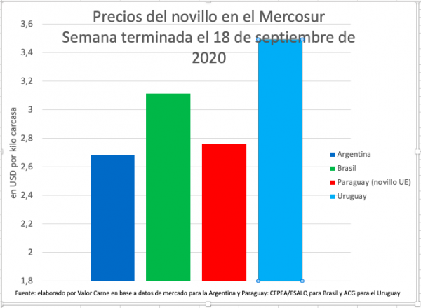 Argentina: el precio del novillo pesado apto para la Hilton quedó en USD 2,68, cuatro centavos menos que en el anterior informe de Valor Carne. El movimiento se dio por una baja de $1 en las ofertas de la industria, potenciada por una devaluación de poco más de medio punto. Tal precio tiene algo de nominal ya que hay empresas que pasan un menor valor pero están comprando menos que lo que demanda su programa de faena, con lo que podrían terminar aumentándolo. Otras han paralizado temporariamente sus compras de novillos a favor de las vacas por sus mejores posibilidades. También hay alguna que debió parar por casos de covid-19. La finalización de casi todas las operaciones de kosher también afecta negativamente la demanda de la categoría.