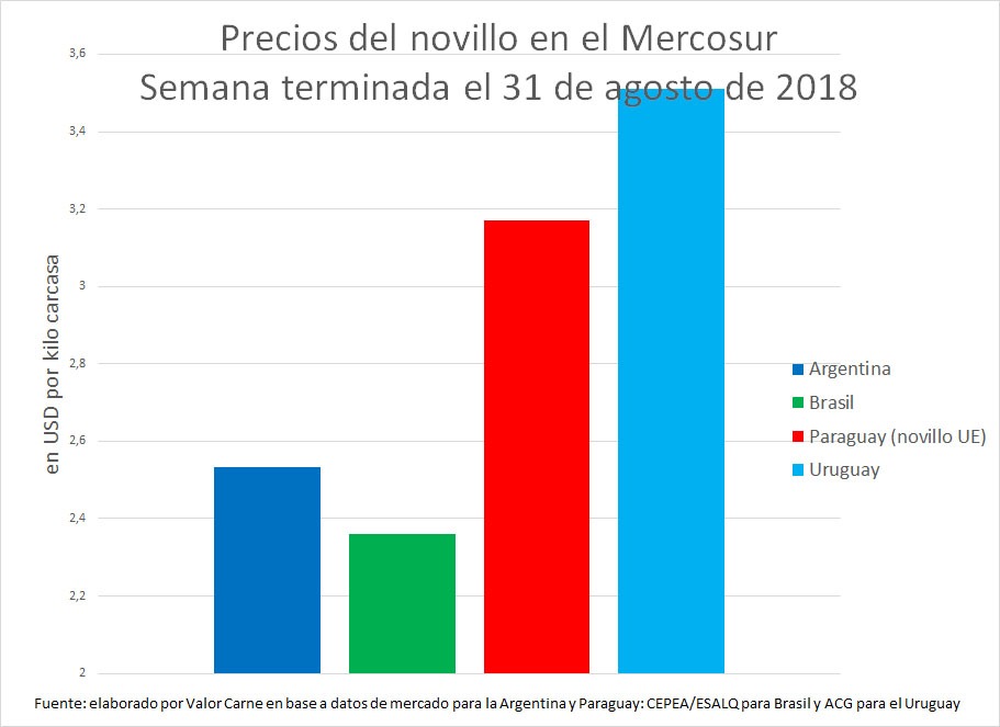 En el mercado argentino, tomando el tipo de cambio en el mercado mayorista de ayer, cuando cerró a ARS 37,40 por dólar, la cotización del novillo se redujo a 2,07 por kilo, 25% por debajo del promedio de sus socios.