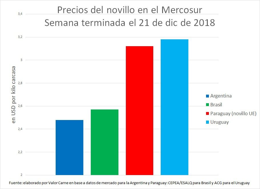 Argentina: el novillo pesado apto para Hilton cayó 4 centavos (1,5%) al cerrar a USD 2,48. Mientras se mantuvo la estabilidad de los precios en pesos, una nueva devaluación del 1,5% (acumula 6% en los últimos 40 días) hizo bajar la cotización en dólares, convirtiéndose en la plaza con mayor retroceso en la moneda norteamericana.