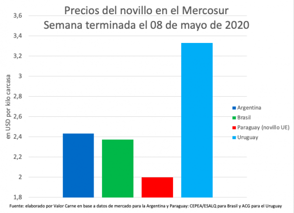 Uruguay: el novillo tuvo una pérdida de un centavo, al cerrar en USD 3,33 por kilo. En el juicio de los consignatarios, hay una oferta moderada, con pocos ganados bien terminados, conformando un mercado estable. Continúa la preferencia de la industria por hacienda de abasto y vacas. La faena en la última semana de abril fue de 36 mil cabezas, 10% menos que en la anterior y 3% arriba del promedio de diez semanas.