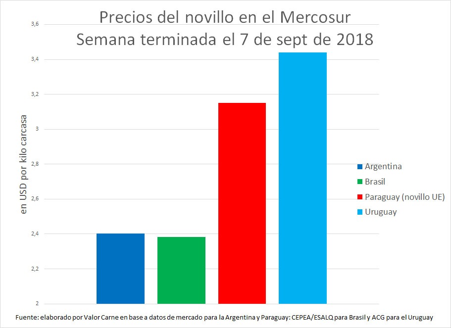 Uruguay: el precio cayó 7 centavos (2%), para cerrar en USD 3,44. Al decir de los consignatarios, con una mayor proporción en la faena de animales de feedlot, los valores volvieron a ajustar a la baja. El procesamiento de la última semana de agosto superó las 42 mil cabezas, 20% más que en la previa (con feriado y paro) y 3% superior al promedio de diez semanas. Éste resultó 5% mayor en forma interanual.