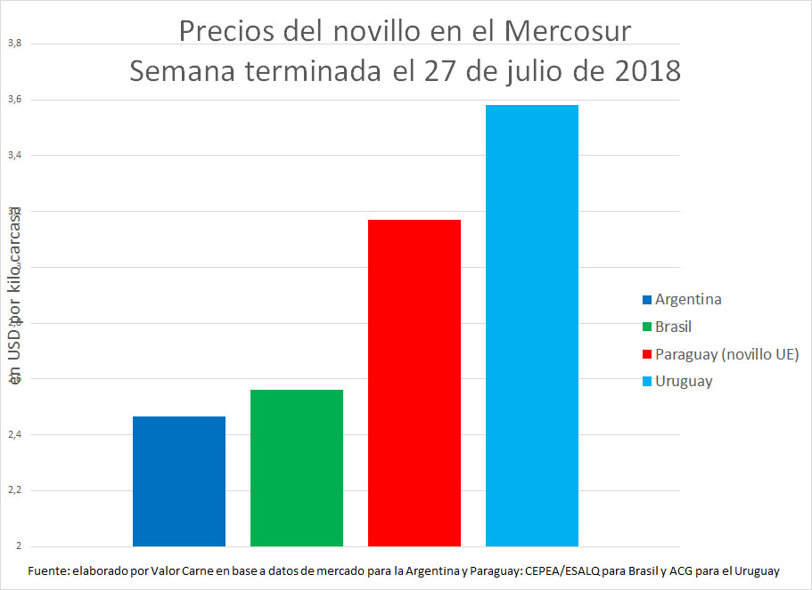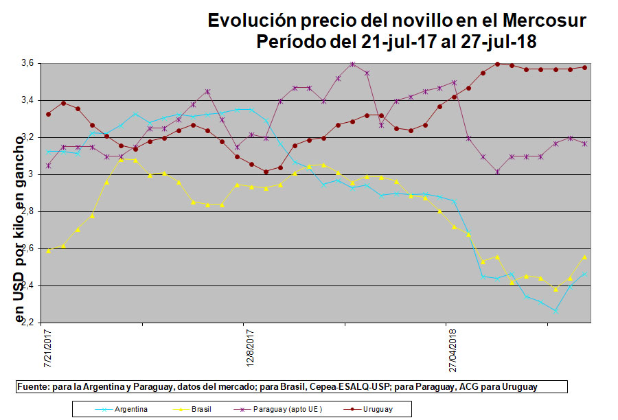 En los últimos 50 días, los valores en Uruguay y en Paraguay fueron bastante estables, con el primero marcando los máximos de la región. En el caso de Brasil y de la Argentina, el recorrido dibuja una V, por lo que tras haber marcado mínimos a principios de julio, las cotizaciones se recuperaron levemente y siguen siendo los dos mercados más competitivos, al igual que sucedió en todo el curso de este año