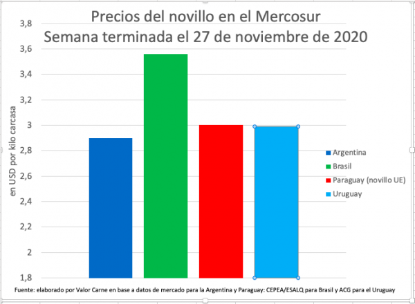 Uruguay: el novillo de exportación cerró en USD2,99, mostrando una caída semanal de seis centavos y continuando con una pendiente de varios meses. Desde hace tres semanas fue superado por Brasil y ahora quedó virtualmente empatado con Paraguay y a solo tres puntos de la Argentina. El buen nivel de faena, con mayor participación de ganado de corral, provocó una nueva corrección de los valores, según el análisis de los consignatarios. La faena de la semana pasada fue de 54 mil cabezas, 4% más que en la previa y 28% por arriba del promedio de diez semanas. La proyección de exportaciones para noviembre de las dos primeras semanas es de 24 mil tec, 29% menos que hace un año. Es posible que el nuevo nivel de la cotización de la hacienda vaya llevando a cambiar el signo negativo de las exportaciones de 2020.