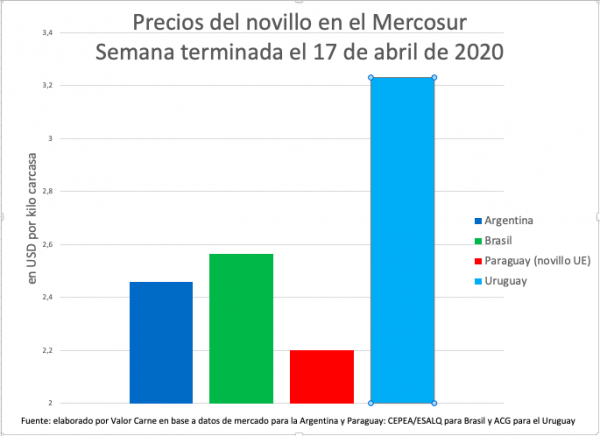 Uruguay: el novillo de exportación aumentó seis centavos (casi 2%), para cerrar en USD 3,23. Los valores se afirmaron por la baja oferta de hacienda y la reapertura de plantas lo que, a su vez, acortó las entradas. La faena de la semana de Pascuas fue de sólo 16 mil cabezas, la mitad de la anterior y 60% menos que el promedio de diez semanas.