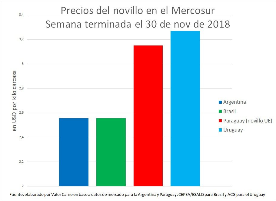 Uruguay: el novillo terminado mostró una desvalorización de 13 centavos (4%), para finalizar en USD 3,27, lo que lo acerca a los niveles de sus vecinos tras haberse mantenido casi todo este año muy por encima de éstos. Con una faena en la que sobresale la participación de novillos y vaquillonas para cuota 481, según la opinión de los consignatarios continúa el ajuste de precios y se alargan las entradas en las plantas. El procesamiento durante la semana pasada fue de casi 54 mil cabezas y por tercer ciclo consecutivo superó el nivel de 50 mil. En tanto, fue 1% inferior a la semana anterior, pero 17% mayor que el promedio de las últimas diez que, a su vez, fue 7% mayor en términos interanuales.