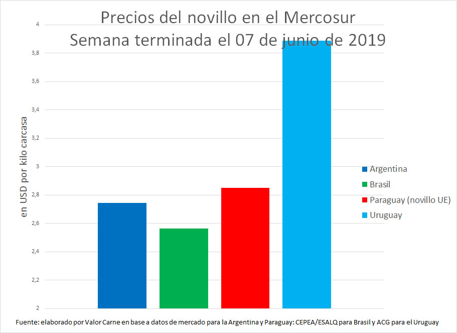 En los últimos diez días, las cotizaciones del novillo en los diferentes países del Mercosur tuvieron el siguiente comportamiento.