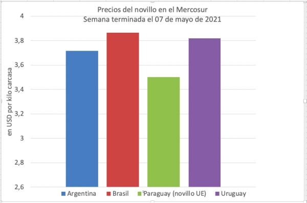 Brasil: el novillo gordo se paga USD3,87, mostrando un aumento intersemanal de tres centavos. Una pequeña baja del precio en reales fue más que compensada por una valorización de la moneda de casi el 2%, cuando la cotización del dólar pasó de 5,49 a 5,40. La relación de precios entre el novillo y el maíz, de 13 veces, es la peor desde hace 5 años. Sigue teniendo el mayor precio de la región. No se publicó aún la exportación de abril.