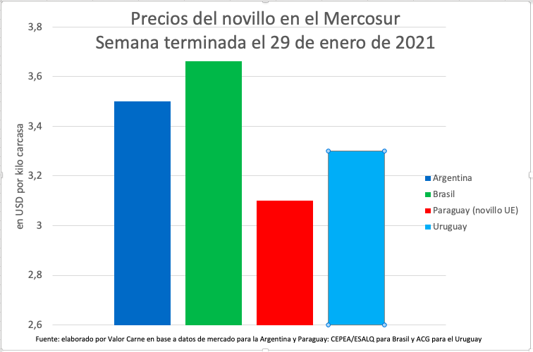 Argentina: el novillo pesado apto para Hilton marcó USD3,50, un centavo más. La escasez de oferta de la categoría no ha permitido una baja de precios como la que registró en estas últimas semanas con la hacienda de consumo y los exportadores subieron sus ofrecimientos en casi $3 en promedio. Ayer se conoció la fuerte baja de exportaciones de diciembre.