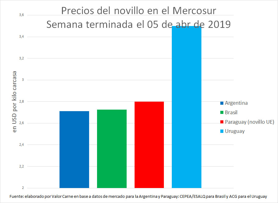 Argentina: el novillo pesado y trazado retrocedió 5 centavos (casi 2%) hasta USD 2,71. Una devaluación 2,7% contrarrestó el aumento promedio de $ 1 en las ofertas de los frigoríficos exportadores. Se situó como la plaza de menor precio del Mercosur.