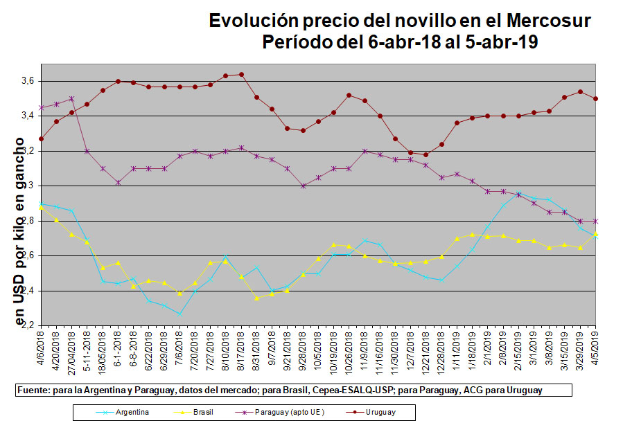 Brasil: única plaza en alza, con una suba del 3% para cerrar en USD 2,73. El novillo gordo registró un aumento de 2% en moneda local que se sumó a una revaluación del real del 1%. Las exportaciones arrancaron en la primera semana de abril a un ritmo débil, proyectando 93 mil t para el mes, 21% menos que en marzo pero 33% más que en abril anterior. Los precios FOB en el cuarto mes del año igualan los del anterior, pero caen 6% en un año.