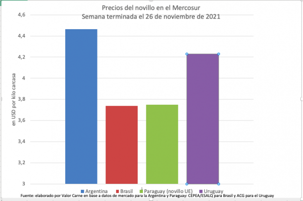 Desde la última semana, las cotizaciones en dólares del novillo en los diferentes países del Mercosur tuvieron el siguiente comportamiento.