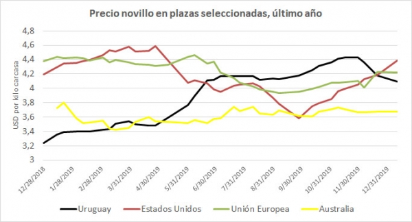 Uruguay: lentamente, siguen moderándose las cotizaciones. El novillo cerró en USD 4,09, un retroceso de 2% en relación a mediados de diciembre. En juicio de los consignatarios, la oferta continúa siendo escasa y hay un bajo nivel de actividad. Se concretan pocos negocios a menores valores y la industria posterga cargas. La faena de la semana de fin de año fue de sólo 12 mil cabezas, la mitad de la semana previa (Navidad) y 70% menos que el promedio de diez semanas, claro que con menos días de operaciones.