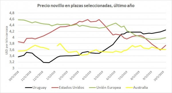 Argentina: el novillo cayó 6 centavos (más del 2%) para cerrar en USD 2,34, siendo la plaza con mayor retroceso en este período. Los frigoríficos exportadores bajaron sus propuestas en pesos en el marco de una abundante oferta de la categoría. La mayoría tiene operaciones cerradas por una semana o más, lo que no es habitual. El promedio ponderado de los ofrecimientos cedió 1%. Esto se sumó a un nuevo retroceso del peso, que mostró una devaluación del 1,6% en el período. El valor actual es el mínimo en los últimos años e igual al de la semana posterior a las PASO.