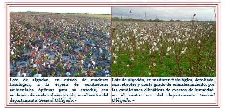 Las actividades de la semana se vieron reducidas, siendo prácticamente nulas, debido a las condiciones ambientales predominantes. Los días con alta humedad ambiente y sin sol, dificultaron el secado, tanto del cultivo como del suelo. Dichas condiciones retardaron la cosecha, el cultivo volvió a rebrotar y nuevamente se debería defoliar, con el perjuicio económico que esta actividad acarrearía. En la zona este algodonera, el avance de la recolección fue de un 62 %, hasta la fecha. Los rendimientos registrados en la zona fueron de 17 – 18 qq/ha en los mínimos y los máximos de 34 – 36 qq/ha. Se recuerda que la fecha límite de destrucción de los rastrojos del cultivo, sería el 31 de mayo para la zona este y el 15 de junio para la zona oeste. En el área algodonera oeste, la realidad continuó siendo muy compleja y sin actividades en todo el período, ante las condiciones climáticas desfavorables y la imposibilidad de la realización de actividades específicas. El proceso de cosecha logrado hasta la fecha fue del orden del 10 %, los rendimientos promedios mínimos fueron de 10 – 12 qq/ ha y los promedios máximos de 20/21 qq/ha, con partes de lotes puntuales de 25 – 26 qq/ha. Se observaron los siguientes estados fenológicos: en R “estados reproductivos” desarrollo de cápsulas, M “maduración”, M1 (primer cápsula abierta), M2 (60 % de cápsula abierta) y madurez fisiológica.