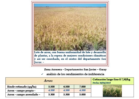 Ante las condiciones climáticas adversas se complicó el proceso de cosecha, quedando totalmente interrumpido desde el viernes 19 del corriente. Prolongando en el tiempo el final del mismo. Hasta la fecha la cosecha se realizó en un 98,5 %, restando la recolección de unas 450 ha, aproximadamente. Los rendimientos promedios alcanzados fluctuaron entre 5.400 a 5.600 kg/ha, en la variedad de arroz largo fino y 4.100 a 4.300 kg/ha, en la variedad de arroz largo ancho. La prolongación del final, provocó la disminución de la calidad del grano y la cantidad de kg/ha, sumándose el daño y el perjuicio que día tras día generaron las aves – patos, bandurrias, entre otras. El estado fenológico en que se encontraron los cultivares restantes, fue de madurez fisiológica. El sector productivo continuó manifestando, reiterando el gran problema y las dificultades en la logística del acarreo del grano a las plantas de secado, acondicionamiento y el traslado del cereal a los molinos, por el paso restringido en el corte de la ruta provincial Nº 1. Dicha situación fue el principal de todos los inconvenientes en infraestructura existentes, que marcó la campaña. El valor comercial del grano de arroz con cáscara, fue de $ 7,50 /kg no sufriendo variación estos últimos quince días.