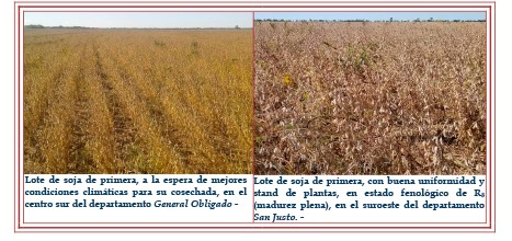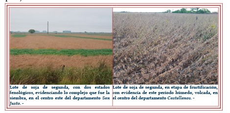Ante lo complejo que fue el proceso de siembra del cultivo, se sumó un período húmedo que complicó y generó consecuencias. Creando condiciones y provocando impactos en los cultivares que comenzaron a detectarse. Los altos porcentajes de humedad, posibilitaron la producción hongos, vuelco de plantas, áreas encharcadas y otras anegadas. Estas características mostraron que el cultivo de soja tardía, fue el más perjudicado y con marcado impacto en la campaña 2018/2019. El grado de avance hasta la fecha fue del orden del 18 %, representando aproximadamente unas 90.450 ha, con un adelanto de 3 puntos, en comparación a la campaña pasada, para el mismo período. Los rendimientos mínimos fluctuaron entre 18 – 20 – 22 qq/ha, los máximos entre 38 – 40 – 42 qq/ha y en lotes puntuales de 45 qq/ha. El cultivo se encontró en un 65 % estado bueno, con sectores o áreas muy buenas y lotes puntuales a excelentes, un 22 % en estado regular y el resto un 13 % en estado regular a malo, con impactos y consecuencias directas por los eventos climáticos sufridos. Se observaron los siguientes estados fenológicos: R “estados reproductivos” R1 (inicio de floración), R2 (floración con uno de los nudos superiores con hojas desarrolladas), R3 (vaina de 5 mm de longitud en nudo), R4 (vaina de 20 mm de longitud en nudo), R5 (comienzo de llenado de semilla en nudo, semilla de 3 mm de longitud), R6 1 (semilla verde de tamaño máximo del nudo), R7 (comienzo de madurez, una vaina con color de madurez) y lotes más avanzados en R8 (madurez plena). – Lote de soja de segunda, con dos estados fenológicos, evidenciando lo complejo que fue la siembra, en el centro este del departamento San Justo.