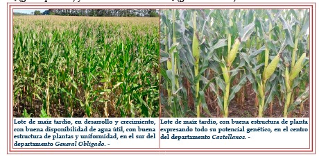 Totalmente paralizado estuvo el proceso de picado-embolsado, para autoconsumo, en las zonas de influencia de las cuencas lecheras. Las condiciones ambientales de la semana no favorecieron la realización de dicha actividad.Recordando que los rendimientos logrados tuvieron valores promedios muy similares a los obtenidos en los cultivares de maíz temprano (o de primera), 12 a 13 m/bolsa/ha. El cultivo continuó su desarrollo y crecimiento normalmente, con muy buena disponibilidad de agua útil en los perfiles de los suelos, atravezando el período crítico sin inconvenientes y con un estado sanitario de bueno a muy bueno. Se observó un amplio rango de estados fenológicos de los cultivares que fueron desde V “estados vegetativos”, en un bajo porcentaje, el resto en R “estados reproductivos” R1 (emergencia de estigma), R2 (cuaje, ampolla), R3 (grano lechoso), R4 (grano pastoso) y los más avanzados en R5 (grano dentado).