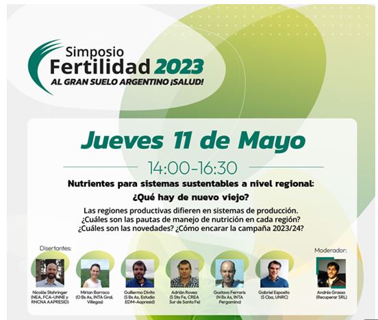 Del mismo participarán especialistas como Nicolás Stahringer (UNNE, Red NEA AAPRESID) como referente de la región NEA, Miriam Barraco (Oeste de Bs As, INTA Gral. Villegas) referente del Oeste, Guillermo Divito (Sur de Bs As, Consultor-AAPRESID) del sudeste, Adrián Rovea (Sur de Santa Fe, CREA Sur de Santa Fe) del núcleo norte, Gustavo Ferraris (Norte de Bs As, INTA Pergamino) por el núcleo sur y Gabriel Espósito (Sur de Córdoba, UNRC) como referente del centro y sur de Córdoba. La moderación estará a cargo del Ing. Agr. Andrés Grasso, responsable de Desarrollo Técnico y Comercial de Recuperar SRL, socio activo de Fertilizar AC.