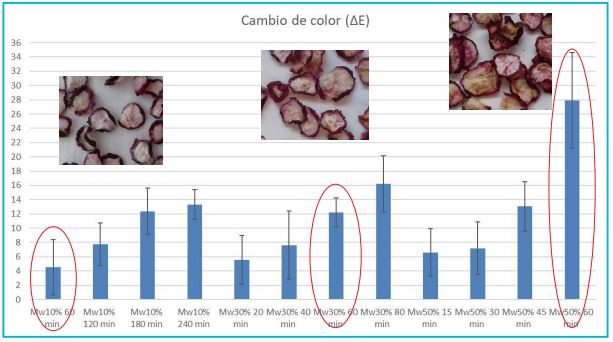 Al respecto del punto 5, en INTA se realizó un ensayo empleando distintos tiempos y potencias en un microondas (ATMA easy cook, potencia máxima nominal 900 W, frecuencia 2450 Mhz). El desarrollo de color fue medido en las superficies de las rodajas de los rabanitos frescos y en los procesados con un colorímetro (MINOLTA, CR-300). Los resultados se muestran en la siguiente figura: