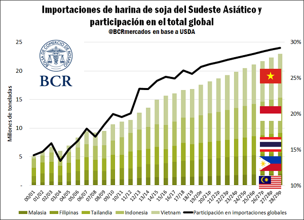 La región del Sudeste Asiático se consolida como una de las principales demandantes de productos agrícolas. Ganando participación en las importaciones globales de harina de soja, maíz y trigo, estos países aparecen como oportunidad para Argentina.