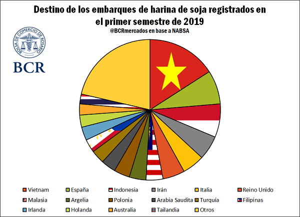 En base a los datos de buques cargados y por cargar de la agencia marítima NABSA, en lo que va del año 2019, Vietnam se sostiene como principal comprador de la harina de soja local con más 2,5 Mt, un 15,9% del total. Indonesia se ubica en el tercer lugar, detrás de España, con el 7,7%, cerca de 1,25 Mt. En conjunto, los 5 países analizaron fueron destino del envío de 5,3 Mt, un 32,8% de los despachos totales.