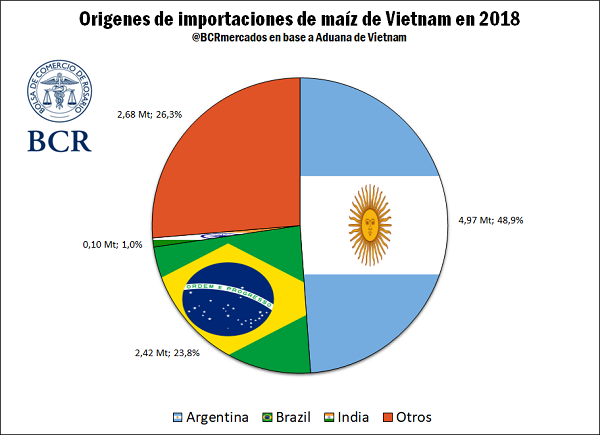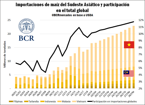 Argentina y Brasil son los principales proveedores de maíz para la región, mientras que Estados Unidos y Rusia son proveedores residuales. En 2018, el 49% de las importaciones de Vietnam se originaron en nuestro país. Malasia, segundo mayor importador de la región con 4 Mt en la campaña actual, es abastecido en un 80% por Argentina y Brasil.