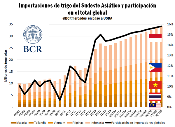 Argentina, luego de la eliminación de las cuotas de exportación explícita o implícita, ha incrementado su producción del cereal dando lugar a mayores exportaciones. En los últimos años, los países del Sudeste Asiático, especialmente Indonesia, se convirtieron en importantes demandantes del trigo local. Es por esto que se profundizará en el análisis sobre las implicancias del papel de esta región en el comercio internacional de trigo.